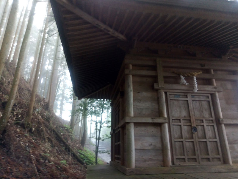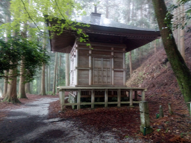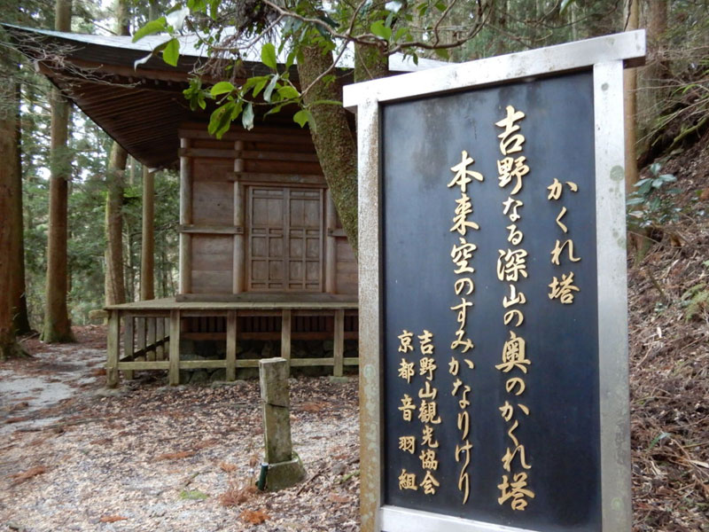 義経隠れ塔は金峯神社裏、うっそうとした杉林の中にありました。案内板に依ると、